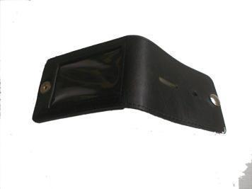 Fait en cuir fendu, bouton pression, fenêtre pour carte d'identité. Se porte à la ceinture. Couleur : noir