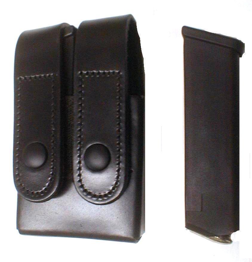 Fait en cuir végétal noir pour deux charger Glock 17, se porte à la ceinture, deux boutons pressions noirs