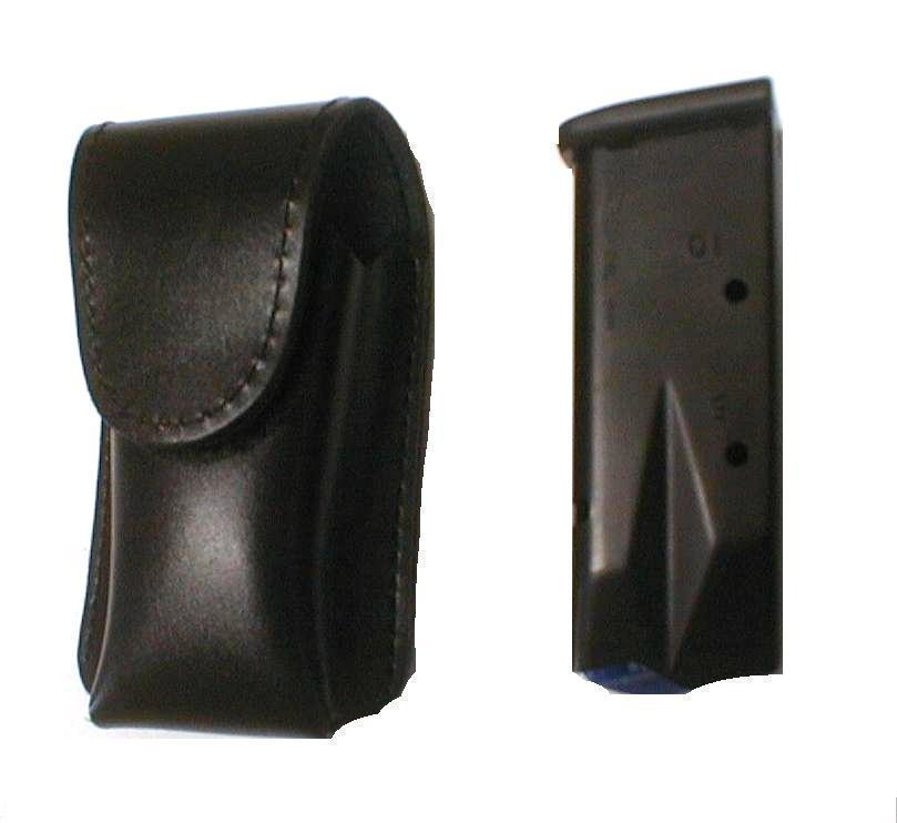 Fait en cuir végétal noir, pour un chargeur Glock 10 balles, se porte à la ceinture, se ferme avec du velcro