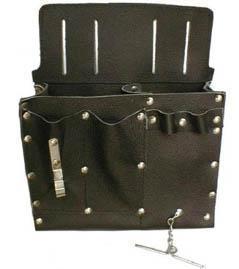 Fait en cuir de vache 5-6 onces, 1 grande poche avec ganse pour tournevis, pochettes pour pinces, mousqueton, porte-marteau, chaîne pour ruban adhésif. Se porte à la ceinture. Couleur: bru