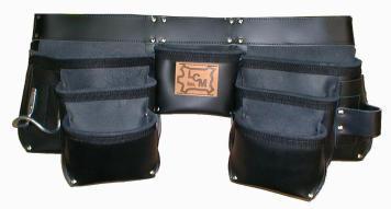 Fait en cuir de 1 ière qualité, 2 grandes poches, 4 moyennes poches, 1 petite pour porte-gallon en cuir, 2 porte-crayons, 1 porte-marteau en cuir et 1 en métal, ceinture en cuir 2'' avec attache en plastique rapide. Couleur : noir